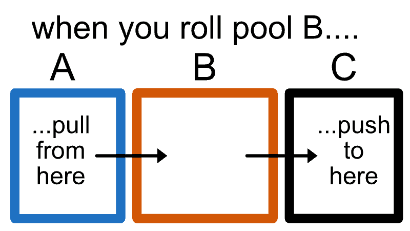Sometimes in the game, you pick a pool to roll, for whatever reason. For every die that shows 1–5, you “pull” 1d6 from the previous pool into the pool you rolled. For every die that shows 6, you “push” 1d6 from the pool you rolled into the next pool.