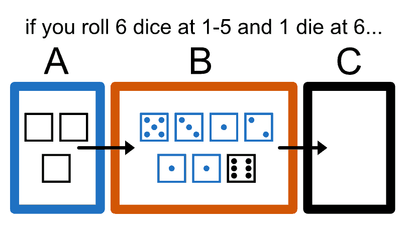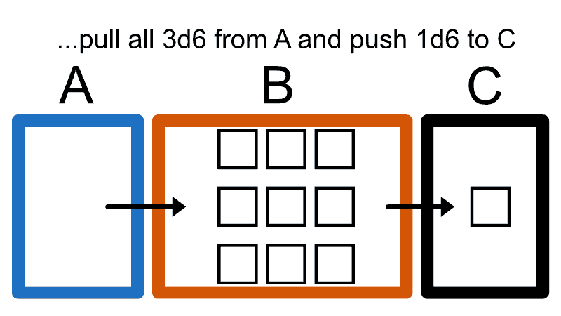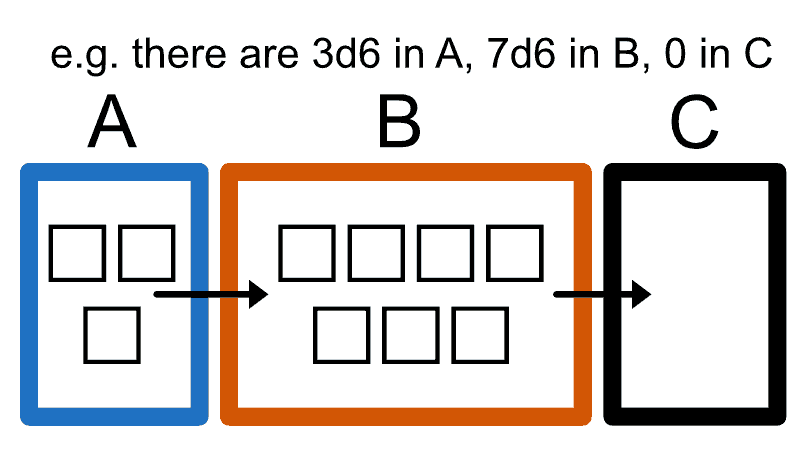 Here's how it works: You have 3 dice pools—A, B, and C—and 10 6-sided dice. The three pools are in a loop, A leading to B, B to C, C back to A, and all the dice start in pool A.