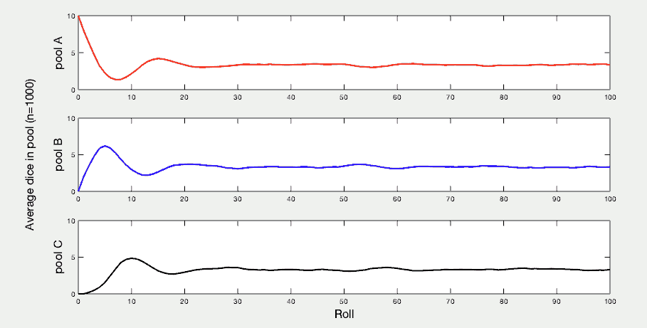 This is the average of 1000 simulations. After about 20 rolls, everything levels out; on average, each of the 3 pools has 1/3 of the dice. Basically, the results show that this mechanic is reliable, but not predictable. You know the pools will peak in turns, but not when, how high, or how long.