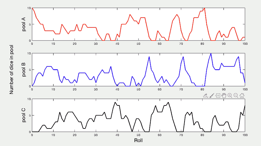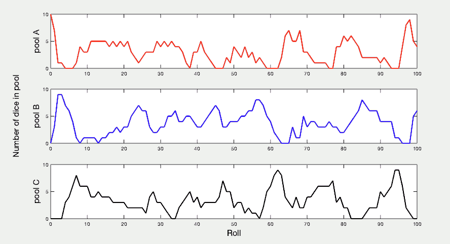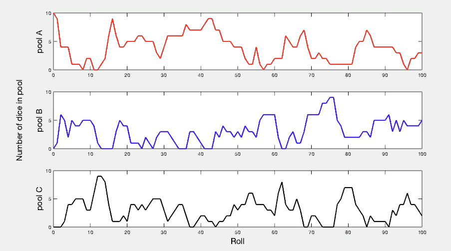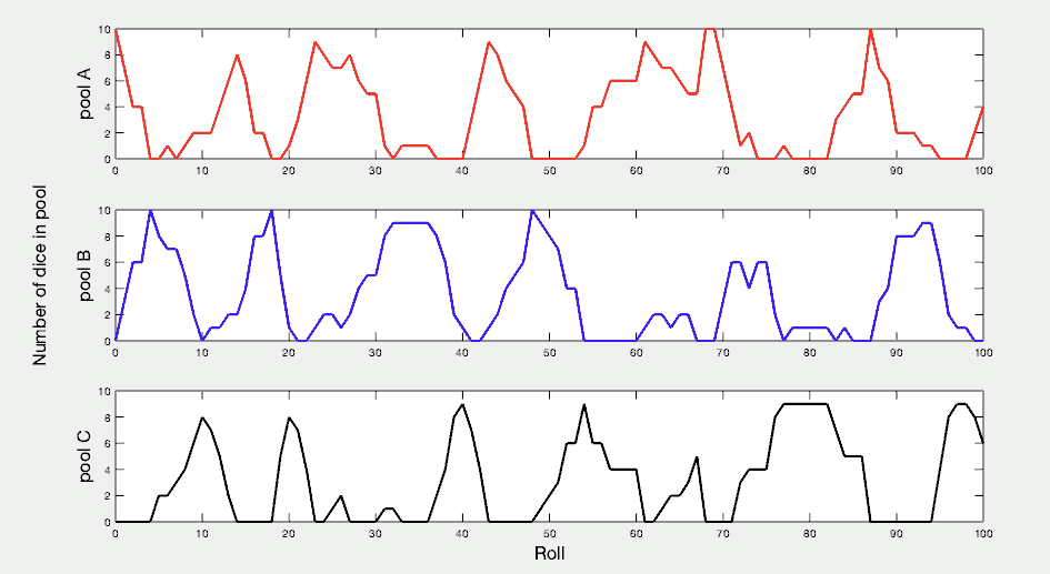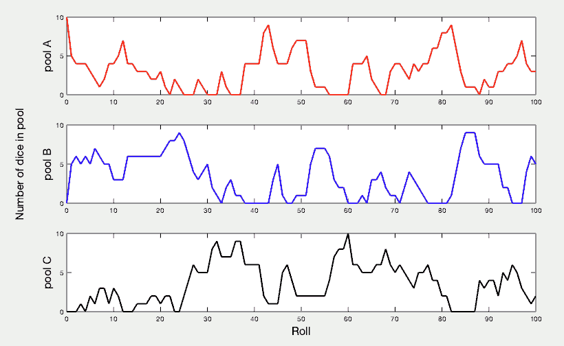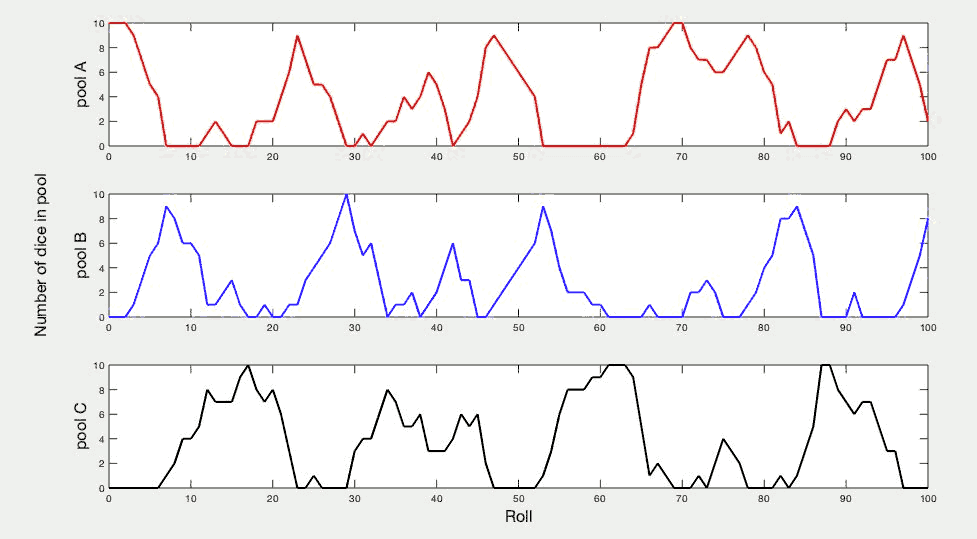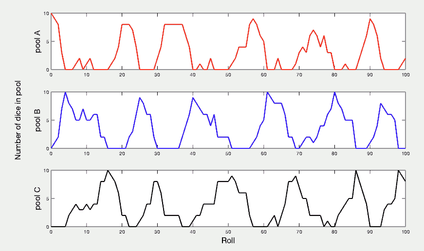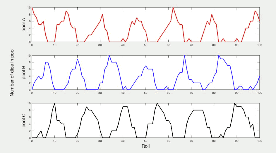 The dice start bunched up in pool A, then filter through to pool B, then to pool C, then back to A again and so on. The pools tend to peak at 7–9 dice instead of going all the way to 10, and the peaks tend to be 4–10 rolls wide. Caveat: This is from a model that just picks pools at random rather than with any reason.