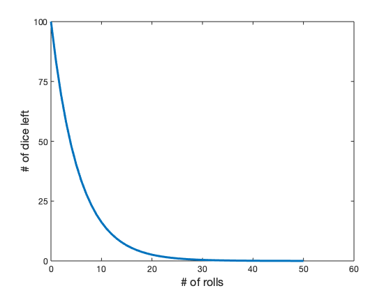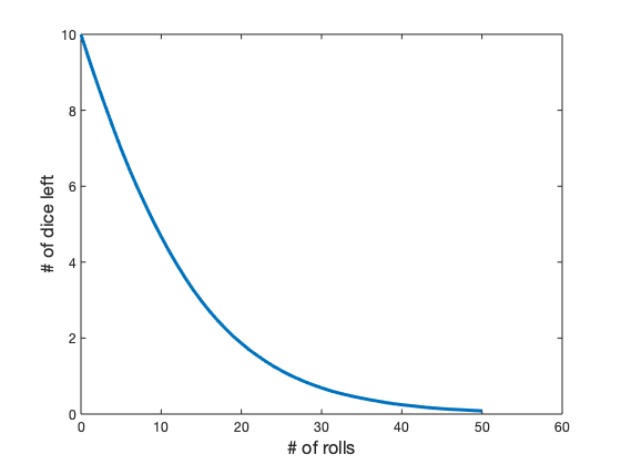 This is like radioactive decay. Your count drops fast at first, then slower and slower the fewer dice you've got. Late in the game you'll probably lose 1 or fewer dice with every roll, which ramps up the tension.