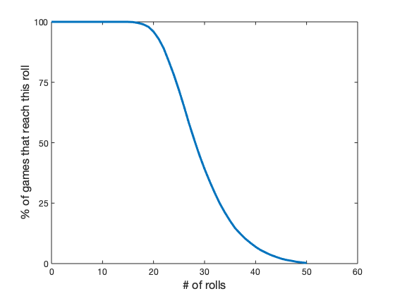 Here's how long the games are overall. Most games make it past the 20th roll; most of the games end between 20 and 40 rolls, and a few last for more than 40 (even more than 50) rolls.