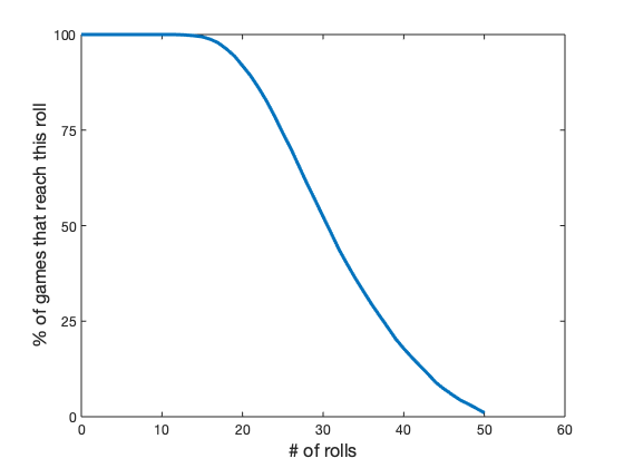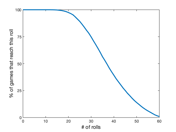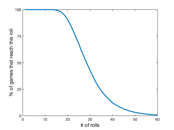Here's how long the games are overall. It's a neat and tidy S-curve: most games make it past 10 rolls, then most games end between 10 and 40 rolls, then a few games make it past 40 rolls.