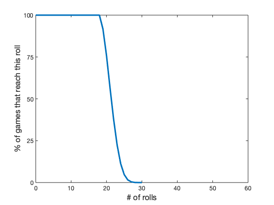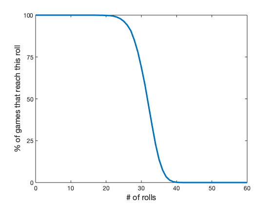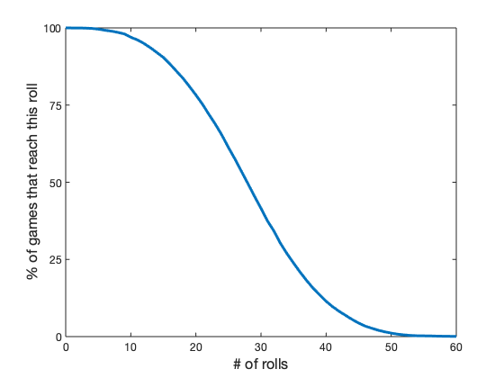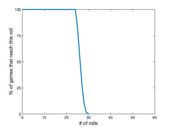 Here's how long the games are overall. No game can end before 25 rolls, and then the number of games that pass each roll from roll 25 to roll 30 drops sharply.