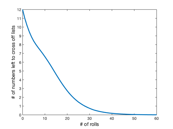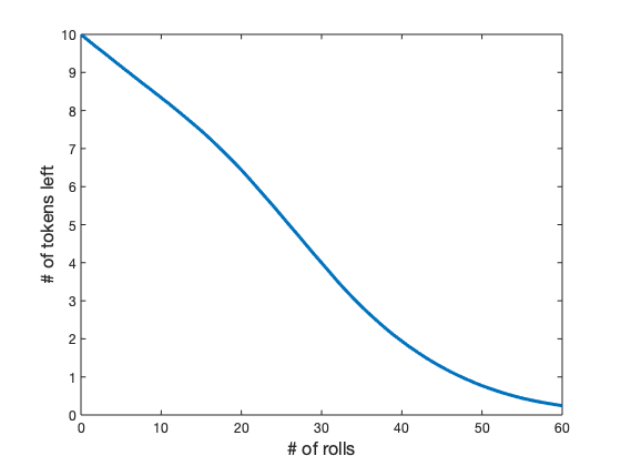 Here's the average game. It's a bit linear at the start, then turns into exponential decay after about 15 rolls.