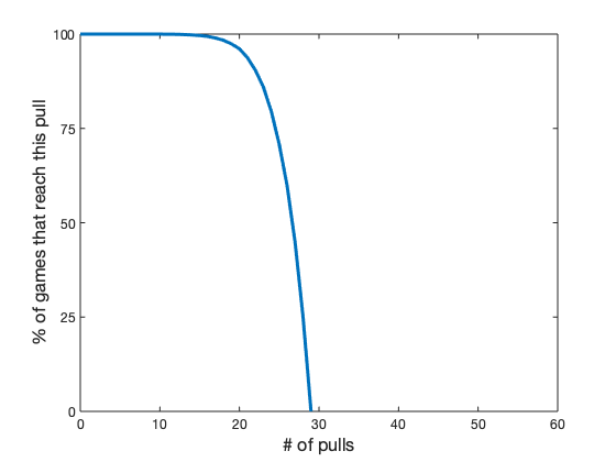 The simulations I plotted for this post are a mix of average games (showing how an average game using each mechanic would go) and game lengths (showing how many games reach each number of rolls/pulls/etc.). Both plots are built from 10000 simulations each. No error bars on the average game plots because I can't be bothered.